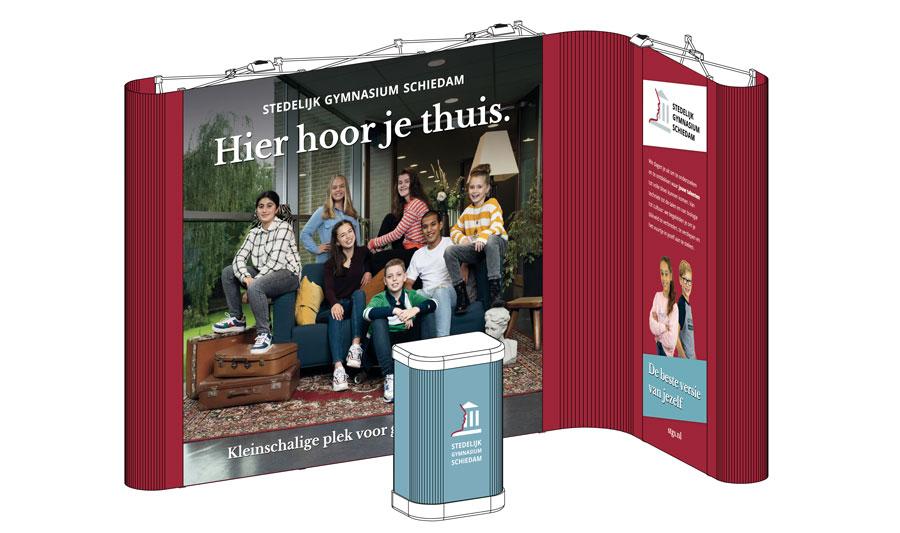 Voor het Stedelijk Gymnasium Schiedam heeft The Dare Company eerder al het logo in een nieuw jasje gestoken. Dit vernieuwde logo hebben onze designers vervolgens vertaald naar de beursstand die de school kan gebruiken op open dagen, meeloopdagen en promodagen. De Griekse zuilen uit het logo komen terug in de ronde vormen die de hoeken zijn van de stand. Daarbij is de balie waarachter de standhouder kan gaan staan ook vormgegeven met de zuilen, terwijl het logo op de voorkant daarvan prijkt. Door de vormgeving lijkt het op een oude Griekse pedestal - erg relevant voor een gymnasium, vonden wij!
